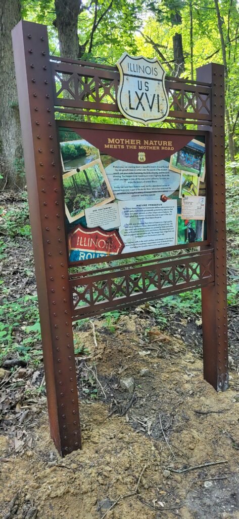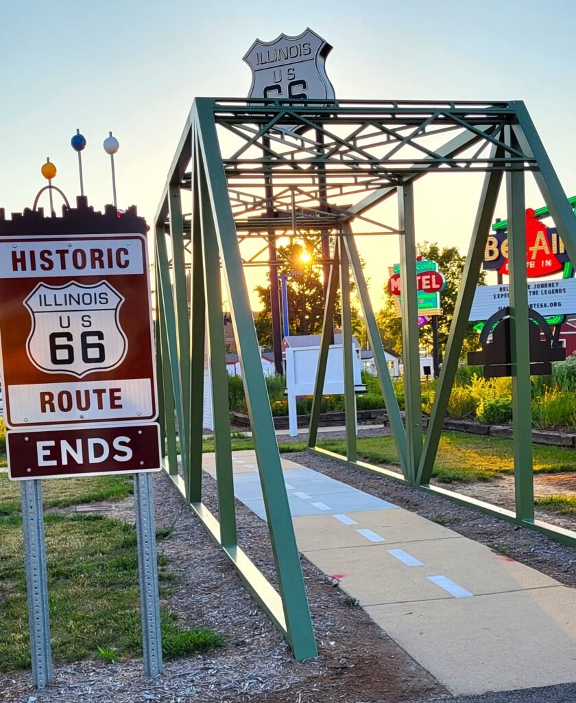 Walk the Carpenter Park Original Route 66 Pavement – Nestled beside the scenic Sangamon River, this quarter-mile stretch of road has remained untouched and overgrown for nearly 90 years. Visitors can leisurely stroll down this historic pathway, enjoying wayside signage that offers fascinating insights into the past while soaking in the breathtaking scenery and rich history of the area.
